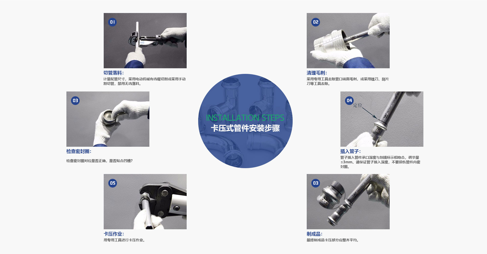 8、安裝簡便:將管子插入管件后用專用的工具卡壓到位即可,比傳統(tǒng)的焊接或者絲接口簡便。